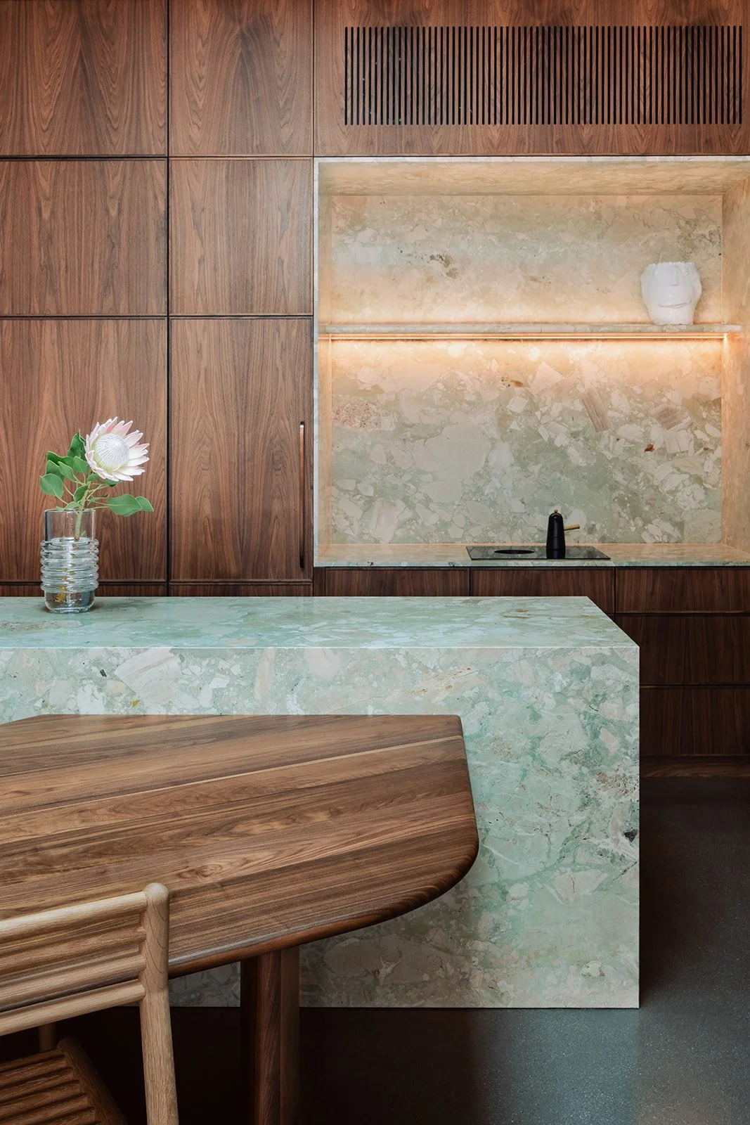 This North Adelaide project weds design and craftsmanship, with a living space defined by warm timber joinery and Monreale marble. Clean lines and integrated storage create a calm, functional layout, with timber panelling adding a strong visual statement that flows effortlessly into the exterior courtyard. The soft palette in the bathroom brings a sense of sanctuary while the marble vanity takes centre stage. The result is a refined, practical interior to enable an effortless inner-city lifestyle.